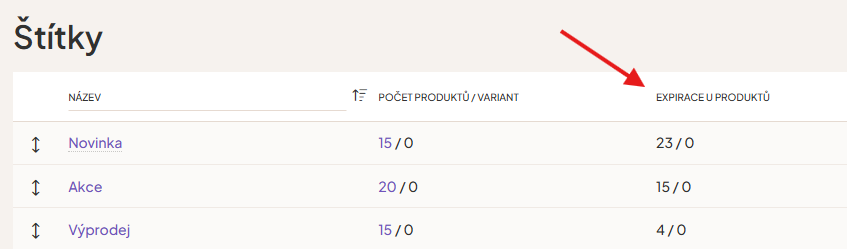 Seznam produktů, u kterých štítek expiruje a bude odebrán, najdete po prokliknutí odkazu pod polem Expirace štítků. Popřípadě můžete využít rozšířenou filtraci v seznamu produktů.