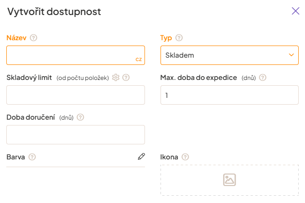 Aby bylo možné přidat produktům jednotlivé dostupnosti, je třeba je nejdříve vytvořit a nastavit, kdy se mají zobrazovat. U každého stavu dostupnosti nastavujete mimo jiné následující pole.
