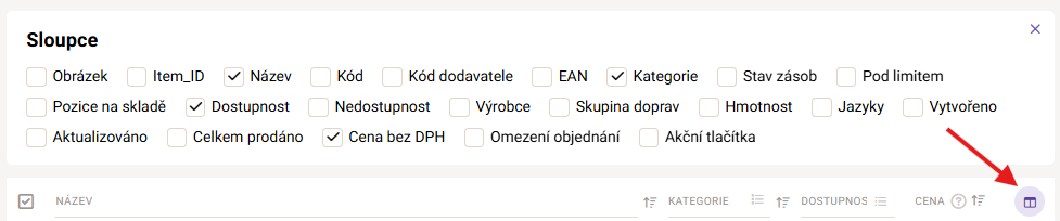 - Nastavte požadované sloupce. Nastavení se aplikuje ihned po zaškrtnutí / odškrtnutí pole.